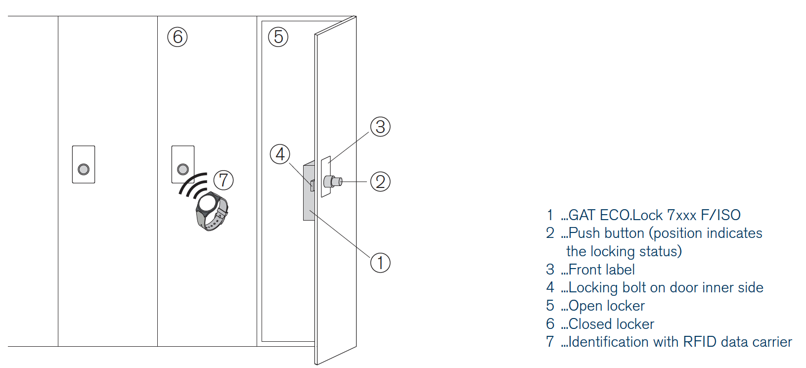 A wireless interface is available upon request, which can be used for the simplest configurations, the reading of bookings and the current status, and for firmware updates. The GAT ECO.Locks can be either freely selectable, permanently assigned, or even configured as rental lockers. Thanks to the timer, an automatic opening function is possible that can be used for cleaning at night for instance.